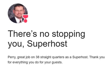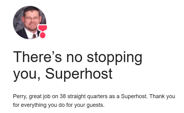 Congratulations to Perry, who in January 2026 earned Airbnb's Superhost title again. That's 38 straight quarters, or 9.5 years that he has earned this honor. Perry believes the most important things hosts can do is provide their guests with a safe, comfortable and reasonably priced place to stay while making them feel right at home. Keep up the awesome job!